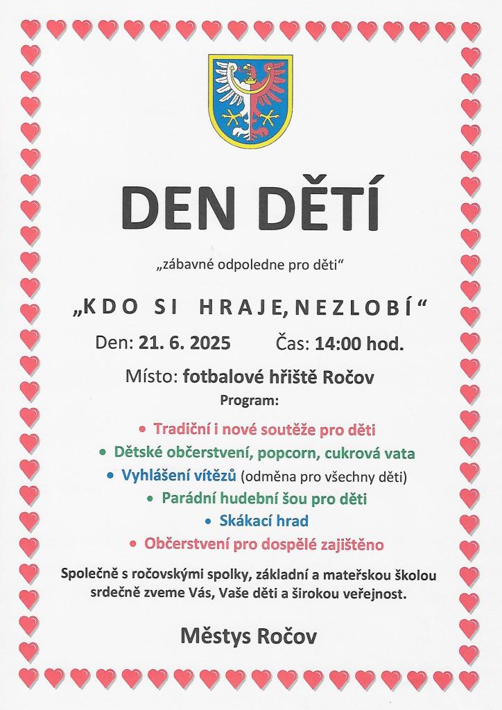 Dne 21.6.2025 se bude konat dětský den. Tradiční místo pořádání dětského dne městysem - ve spolupráci s ročovskými spolky a se školami - je areál sokolovny.